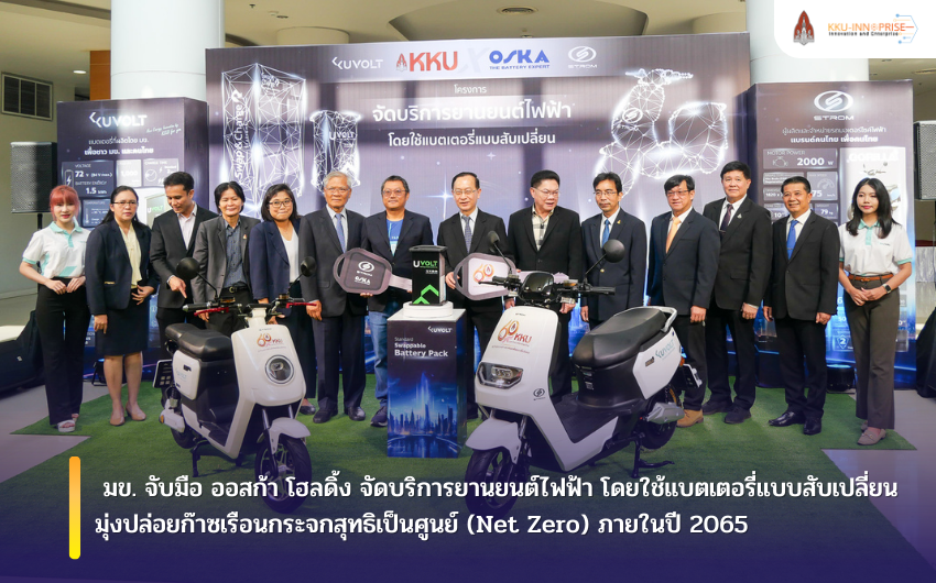 เมื่อวันอังคารที่ 23 มกราคม 2567 เวลา 09.00 น. มหาวิทยาลัยขอนแก่น จัดแถลงข่าว “โครงการจัดบริการยานยนต์ไฟฟ้าโดยใช้แบตเตอรี่แบบสับเปลี่ยน” โดยมี รองศาสตราจารย์ นพ.ชาญชัย พานทองวิริยะกุล อธิการบดีมหาวิทยาลัยขอนแก่น กล่าวเปิดงาน พร้อมด้วย ผู้ช่วยศาสตราจารย์ นพ.ธรา ธรรมโรจน์ รองอธิการบดีฝ่ายบริหาร ผู้ช่วยศาสตราจารย์ ดร.อาวุธ ยิ้มแต้ รองอธิการบดีฝ่ายโครงสร้างพื้นฐานและสิ่งแวดล้อม รองศาสตราจารย์ ดร.นงลักษณ์ มีทอง ผู้อำนวยการโรงงานแบตเตอรี่และพลังงานยุคใหม่ พันโท หม่อมราชวงศ์ พีรานุพงศ์ ภาณุพันธ์ ที่ปรึกษากรรมการผู้จัดการ บริษัท ออสก้า โฮลดิ้ง จำกัด นายสุรชัย สินประกอบ พลังงานจังหวัดขอนแก่น และนายธีระศักดิ์ ฑีฆายุพันธุ์ นายกเทศมนตรีนครขอนแก่น ร่วมงานแถลงข่าว ในการนี้มีสื่อมวลชน และแขกผู้มีเกียรติ ร่วมกิจกรรมเป็นจำนวนมาก ณ ห้องประชุมสารสิน ชั้น 2 อาคารสิริคุณากร มหาวิทยาลัยขอนแก่น