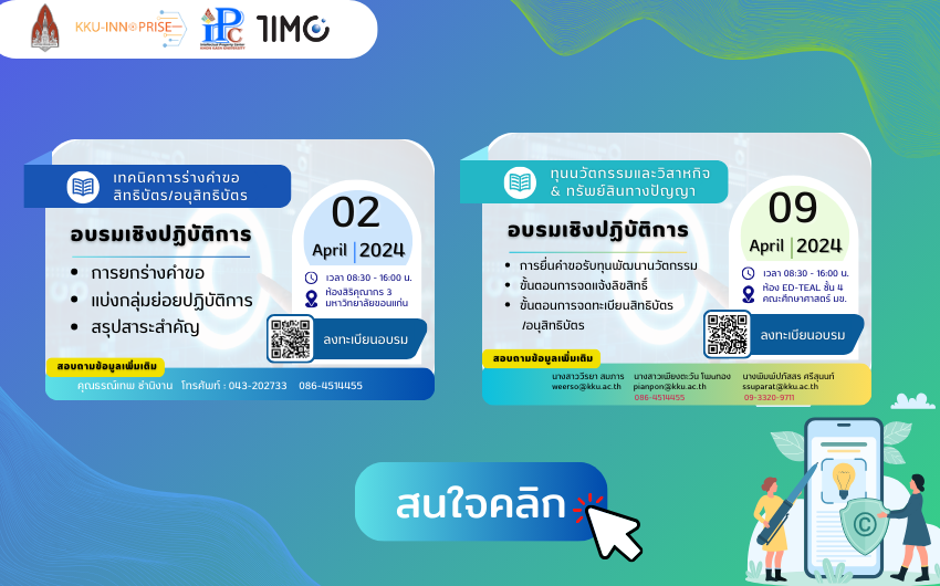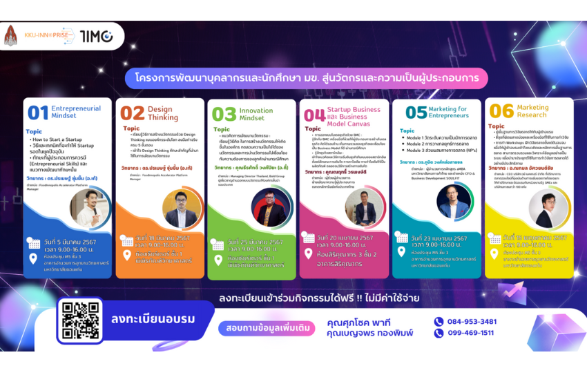 <div><strong>ฝ่ายนวัตกรรมและวิสาหกิจ โดยศูนย์บริหารเทคโนโลยีและนวัตกรรม ขอเชิญผู้ที่สนใจเข้าร่วมการอบรม “โครงการพัฒนาบุคลากรและนักศึกษา มข. สู่นวัตกรและความเป็นผู้ประกอบการ </strong></div><div><strong><br></strong><div> เพื่อส่งเสริมและพัฒนาศักยภาพ คณาจารย์ นักวิจัย บุคลากรและนักศึกษามหาวิทยาลัยขอนแก่น ให้มีความเป็นนักนวัตกรและความเป็นผู้ประกอบการ สามารถสร้างหรือพัฒนานวัตกรรมอย่างเป็นระบบ โดยวิทยากรที่มีความรู้ ความเชี่ยวชาญ และเป็นผู้ประกอบการตัวจริง </div><div><strong>*** งานนี้เฉพาะคณาจารย์ นักวิจัย บุคลากรและนักศึกษามหาวิทยาลัยขอนแก่น เท่านั้น !!!</strong></div></div><div><strong>จัดอบรมระหว่างวันที่ 5 มีนาคม 2567 – 15 พฤษภาคม 2567 จำนวน 7 หลักสูตร ประกอบด้วย</strong></div><div><strong>1. หลักสูตร “Entrepreneurial Mindset How to Start a Startup & Learning Journey Piece of Advice”</strong></div><div> ในวันอังคารที่ 5 มีนาคม 2567 เวลา 9.00-16.00 น. ณ ห้องประชุม M5 ชั้น 3 อาคารอำนวยการอุทยานวิทยาศาสตร์</div><div> </div><div><img width="700" alt="" src="http://innoprise.kku.ac.th/file/20240213/20240213-013856-65cb0e80a00e8.png" height="394"></div><div><br><img width="700" alt="" src="http://innoprise.kku.ac.th/file/20240207/20240207-025431-65c3373716dc1.png" height="990"></div><div><br><strong>2. หลักสูตร ”Design Thinking”</strong><br>ในวันจันทร์ที่ 18 มีนาคม 2567 เวลา 9.00-16.00 น. ณ ห้องเธียร์เตอร์ ชั้น 1 พิพิธภัณฑ์วิทยาศาสตร์</div><div><br><br><img width="700" alt="" src="http://innoprise.kku.ac.th/file/20240207/20240207-025443-65c33743706f4.png" height="990"></div><div> </div><div><strong>3. หลักสูตร “Innovation Mindset”</strong><br> ในวันจันทร์ที่ 25 มีนาคม 2567 เวลา 9.00-16.00 น. ณ ห้องเธียร์เตอร์ ชั้น 1 พิพิธภัณฑ์วิทยาศาสตร์</div><div><br><img width="700" alt="" src="http://innoprise.kku.ac.th/file/20240207/20240207-025539-65c3377bb5bba.png" height="990"><br><strong>4. หลักสูตร “Startup Business”</strong><br>ในวันเสาร์ที่ 20 เมษายน 2567 เวลา 9.00-12.00 น. ณ ห้องสิริคุณากร 3 ชั้น 2 อาคารสิริคุณากร<br><strong>5. หลักสูตร “Business Model Canvas”</strong><br> ในวันเสาร์ที่ 20 เมษายน 2567 เวลา 13.00-16.00 น. ณ ห้องสิริคุณากร 3 ชั้น 2 อาคารสิริคุณากร</div><div><strong><br></strong><img width="700" alt="" src="http://innoprise.kku.ac.th/file/20240207/20240207-025728-65c337e85163b.png" height="990"></div><div> </div><div><strong>6. หลักสูตร “Marketing for Entrepreneurs”</strong><br>ในวันอังคารที่ 23 เมษายน 2567 เวลา 09.00-16.00 น. ณ ห้องประชุม M5 ชั้น 3 อาคารอำนวยการอุทยานวิทยาศาสตร์</div><div><img width="700" alt="" src="http://innoprise.kku.ac.th/file/20240207/20240207-025753-65c3380192152.png" height="990"><br><br><strong>7. หลักสูตร “Marketing Research”</strong><br> ในวันพุธที่ 15 พฤษภาคม 2567 เวลา 09.00-16.00 น. ณ ห้องประชุม M5 ชั้น 3 อาคารอำนวยการอุทยานวิทยาศาสตร์</div><div><img width="700" alt="" src="http://innoprise.kku.ac.th/file/20240207/20240207-025810-65c338124e665.png" height="990"><br><br>โดยท่านสามารถเลือกเข้าอบรมได้มากกว่า 1 หลักสูตร<br>เปิดลงทะเบียนตั้งแต่วันนี้เป็นต้นไป จนกว่าจะครบตามจำนวนที่กำหนด<br><strong>อบรมฟรี ไม่มีค่าใช้จ่าย</strong> ที่ <a rel="nofollow" target="_blank" href="https://kku.world/m2811">https://kku.world/m2811</a><br>สอบถามข้อมูลเพิ่มเติมได้ที่ </div><div> คุณศุภโชค พาที เบอร์ภายใน 50694 หมายเลขโทรศัพท์มือถือ 084-9533481 เมล <a rel="nofollow" target="_blank">suppat@kku.ac.th</a></div><div> คุณเบญจพร ทองพิมพ์ เบอร์ภายใน 50449 หมายเลขโทรศัพท์มือถือ 099-4691511 เมล <a rel="nofollow" target="_blank">banjko@kku.ac.th</a><br